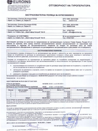 ОБЩИ УСЛОВИЯ ЗА ТУРИСТИЧЕСКИ ПАКЕТ И ЕДНОДНЕВНИ ОРГАНИЗИРАНИ ПЪТУВАНИЯ СЪГЛАСНО ЗАКОНА ЗА ТУРИЗМА - „ЕЛЕГАНС БЪЛГАРИЯ“ ЕООД, САЙТ BLAGOSLOVENA.COM. ОНЛАЙН ТУРОПЕРАТОР С ЛИЦЕНЗ № РК-01-8341 застрахователната полица „Отговорност на Туроператора” 03700100005912, валидна до 2.08.2026 1. УСЛОВИЯ ЗА ЗАПИСВАНЕ 1.1.Записване и внасяне на аванс – Записване за организирано пътуване се извършва само онлайн през сайта blagoslovena.com или на e-mail info@blagoslovena.com. Направената по този начин резервация се потвърждава в срок от 48 часа след получаването й. До 72 часа от изпращането на резервацията от Потребителя и след нейното потвърждаване е необходимо Потребителят да внесе 30% аванс за пътувания с продължителност 2 или повече дни и 100% от цената на пътуването за еднодневни пътувания. 1.2.Потребителят е длъжен да се увери, че притежава всички необходими лични документи, които са изисквани за дадена дестинация, включително и пълномощни за извеждане на лица под 18 години извън границите на България. 1.3.При отказ на митническите и гранични служби да допуснат Потребителя да премине граница, поради липса на изрядни документи, Туроператорът не носи отговорност и не дължи връщане на заплатената цена за туристическото пътуване. 1.4.Изпратеният от Туроператора окончателен текст на договор за организирано пътуване на Потребителя, се смята за сключен и без подписи, стига да е потвърден от страните по електронна поща или с конклудентни действия, включително плащане на част от цената 2. ЦЕНИ, СРОКОВЕ И НАЧИН НА ПЛАЩАНЕ 2.1.Цените на всяка програма са упоменати на сайта blagoslovena.com и касаят конкретната програма за посочените дати. Програмата е неразделна част от договора за туристически пакет. Цените за всяка програма включват услуги, подробно описани за всяка програма поотделно. 2.2.Цените по всички сключени договори са гарантирани от агенцията. Туроператорът си запазва правото да променя цената на програмата, след сключване на договор, но не по-късно от 20 дни преди датата на отпътуване при възникване на следните обстоятелства: промяна на цената на горивата, промяна на държавни такси; промяна на пристанищни такси; промяна в данъчните ставки; промяна в обменния валутен курс, относим към договора, в периода между сключването му и датата на отпътуването. В тези случаи Туроператорът си запазва правото да поиска тези допълнителни разходи да бъдат поети от Потребителя. Увеличението на цената на пакета, но не с повече от 8%, вследствие на обективно посочени причини не може да бъде повод за отказ от страна на потребителя. 2.3.Заплащането се извършва по банков път или чрез платежните инструменти, посочени на сайта blagoslovena.com. IBAN BGN - BG58STSA93000030106488 3. ВИЗОВ РЕЖИМ И МЕДИЦИНСКИ ИЗИСКВАНИЯ 3.1.Визовият режим, в случай че е необходима виза, е посочен за всяка конкретна програма. Тази информация е валидна за лица с българско гражданство. Ако имате друго гражданство, моля осведомете се в съответната консулска служба. Туроператорът не носи отговорност при отказ на виза. При отказ на виза влизат в сила посочените условия за анулация за съответната екскурзия или почивка. 3.2.В случай че за конкретно пътуване са приложими специфични медицински и здравни изисквания, те са посочени в конкретната програма. Ако изрично не е посочена такава информация, това означава, че няма медицински и здравни изисквания, свързани с пътуването. 4. Х